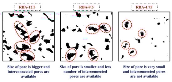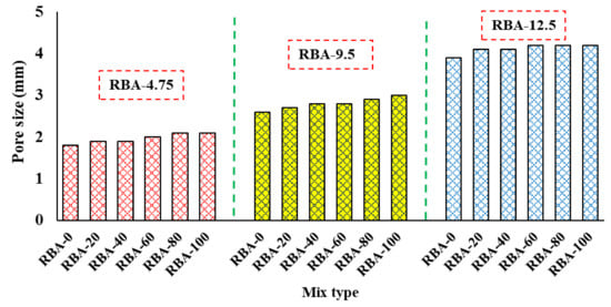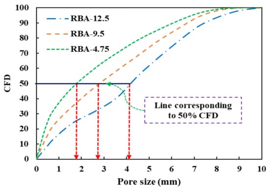 Another major outcome obtained from IPT is calculating the size of the pores in each mix. For obtaining the size of pores, two assumptions are taken in this study, (a) the shapes of the pores are circular, and (b) each pore has a distinct property. Several pore sizes are obtained from a single RAE, and then the cumulative frequency distribution (CFD) curves are drawn to find the equivalent pore size. In the present study, the equivalent pore size is taken as the d50 value, i.e., the pore size matching with 50% CFD curve is considered as d50. The variation of CFD curves for different mixes is shown in Figure 9, and the average pore sizes for all the mixes are mentioned in Figure 10. It can be seen that the size of the pores for the mixes produced with RBA-12.5 is much larger than that of the mixes produced with RBA-4.75, which is mainly attributed to the presence of larger-sized aggregates in the mixes of RBA-12.5. It can also be understood from Figure 7, where the processed images are shown for three different sizes of aggregates. The available pore size for RBA-4.75 is much smaller as compared to RBA-12.5.