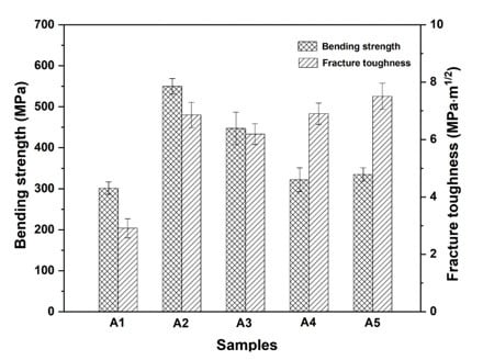 To investigate the influence of the additives on the bending strength and fracture toughness of the Al2O3 matrix composites, samples with different compositions were prepared. The number and the exact composition of samples ae shown in Table 1.