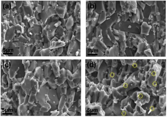 where σ0 and κ are material constants and independent of grain size, and d is grain size. According to the classic Hall–Petch relationship, grain refinement contributes to enhance strength of metals []. In Al2O3 and its CNTs reinforced composite, a similar relationship between grain size and bending strength exists, which means that refined grains are ascribed to bending strength improvement [,,]. Therefore, the addition of ZrO2 leads to grain refinement, and thus to a degree of bending strength enhancement. However, phase transformation strengthening and toughening mechanism of ZrO2 is believed the main reason why the bending strength and fracture toughness are improved significantly. As well-known, the metastable t-ZrO2 in the partially stabilized ZrO2 is the main strengthening and toughening factor during the samples fracture []. In the stress field of the crack, the transformation of t-ZrO2→m-ZrO2 accompanied by a volume dilatation []. The volume effect and shape effect originating from the transformation will absorb energy, leading to a great enhancement of mechanical properties. When MXene is added in A3, the mechanical properties decrease unexpectedly. The SEM images in Figure 5 can give some explanations. When only ZrO2 is added, the ZrO2 grains are mainly located at Al2O3 grain boundaries, and the grains grow up after sintering. It is noticeable that the fracture mode of the sample (A2) is mainly trans-granular fracture as shown in Figure 5a, which is believed to consume more energy during the fracture process. Additionally, the inserted elongated Al2O3 grains are also helps to improve the mechanical properties due to more energy consumption (Figure 5b). However, when MXene is added combine with ZrO2, most of the elongated Al2O3 grains are missing as shown in Figure 5c. Meanwhile, the fracture mode is mainly inter-granular fracture. Compare with A2, it can be observed in Figure 5d that the growth of ZrO2 grains are inhibited. In particular, many ZrO2 grains are dropped out, and leaving holes on the surface during the fracture process (yellow circles in Figure 5d). Therefore, the mechanical properties of A3 decrease. Anyway, A3 still possesses good bending strength and fracture toughness, about 48% and 113% higher than A1, respectively.