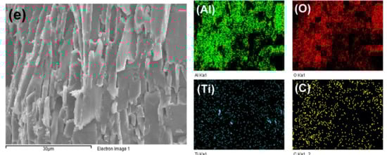 In comparison to A1, A4, and A5, some interesting results have also been found. Although the bending strength is increased slightly, fracture toughness is improved significantly (Figure 1). When only Al2O3 platelet is added, the fracture toughness is increased by 137%, which is from 2.91 MPa·m1/2 (A1) to 6.90 MPa·m1/2 (A4). The simultaneous addition of Al2O3 platelet and MXene is expected to produce exciting mechanical properties. It is surprising that the fracture toughness of 7.51 MPa·m1/2 is achieved. As many literatures report, the addition of some additives is favorable to anisotropic grain growth behavior, thus leading to self-reinforcement in Al2O3 ceramic [,,]. Although no liquid-formation impurities were introduced, the platelet shape of Al2O3 platelet still induced the abnormal grain growth, and forming a layered structure as shown in Figure 6. When using Al2O3 platelet as additive alone (A4), the layered Al2O3 grains arrange regularly (Figure 6a), besides, pores can be observed on the surface as exhibited in Figure 6b, causing a decrease of relative density (Figure 2). With the simultaneous addition of Al2O3 platelet and MXene, the Al2O3 layers become thinner and disordered (Figure 6c). The MXene distributes homogenously on the surface as the EDS mapping displayed in Figure 6e. Particularly, when the MXene platelet inserts into the Al2O3 layers, they will inhibit grain growth at one direction, and fill in the pore between layers (Figure 6d). Therefore, A5 has higher relative density than A4. What is more, the disordered layers are conducive to crack deflection and layer lock, thus are conducive to energy consumption and mechanical property enhancement. The zigzag crack path can be seen clearly for both A4 and A5 in Figure 7. Compare with A4 (Figure 7a), A5 displays a more tortuous cracks propagation path (Figure 7b), so it possesses the highest fracture toughness in this work. In general, the above additives play a positive effect on the mechanical properties of Al2O3 ceramic, either bending strength or fracture toughness. The results will guide the design and fabrication of high-strength and high-toughness alumina ceramics by introducing proper additives. Meanwhile, it can provide refence to investigate the effect of MXene on the properties of ceramic matrix composites.