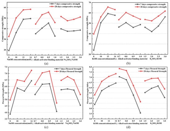 - For the flexural strength, the increase in the concentration of alkali solution had a positive correlation with the promotion effect on both Na-based and K-based geopolymers. With the increase in the Na2SiO3/MOH mass ratio, the flexural strength of both site geopolymers showed a trend of increasing and then decreasing. Increasing the mass of the alkali activator negatively affected the flexural strength of the K-based geopolymers, while it showed a trend of increasing and then decreasing for the Na-based geopolymers.