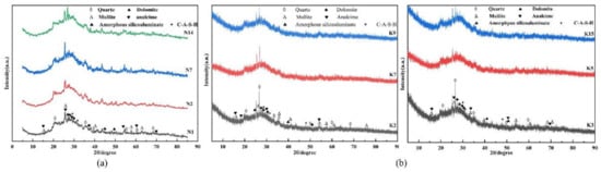 The XRD patterns of both the Na-based and K-based geopolymers at 28 days were plotted separately, as shown in Figure 4a,b.