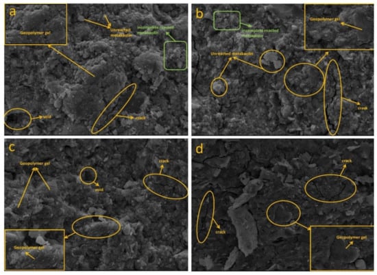 The SEM microscopic images of Na-based and K-based geopolymers cured at room temperature for 28 days are shown in Figure 5 and Figure 6. Figure 5a shows that when the alkaline solution concentration was low, there was a considerable amount of incompletely reacted metakaolin in the N1 specimens. At the same time, the microstructure of the specimens also showed that there were some microcracks and pores in the geopolymer matrix, which were responsible for the poor mechanical properties of N1 in the test group. The concentration of the alkaline solution was too low to dissolve sufficient silicon–aluminum monomers, resulting in a large number of unreacted or incompletely reacted metakaolin particles present in the specimen matrix. This becomes a structural defect in the matrix and hinders the development of the gel phase network in the geopolymer, degrading the mechanical properties of the geopolymer [,]. Yuan’s research [] showed that the presence of more microcracks in the specimens indicates that there is a delay in the geopolymerization reaction, which may be due to the slow activation of the early reaction system with low alkali content or fast early activation. The unreacted metakaolin particles are wrapped in silicoaluminate gel, which hinders their chemical reaction with the alkali activator. With the increase in the alkali solution concentration, it can be seen from Figure 5c,d that the unreacted metakaolin decreased and a gradually denser gel phase presented in the matrix, which caused the internal structure of the geopolymer to become denser. According to the XRD analysis, it is clear that the coexistence of N-A-S-H and C-(A)-S-H in the gel system filled the voids present in the structure and combined adjacent solids together to form a continuous and dense matrix structure [], which improved the mechanical properties of the specimens. By comparing Figure 5a,b, it can be seen that the microstructure of the geopolymer in (b) was a little denser and more gels were produced. Specimen N2 contained more sodium silicate solution than specimen N1, where the use of silicate helped to enhance the geopolymerization process, accelerated the dissolution of silica and alumina in metakaolin, and increased the sodium ion content of the mixture, which acted as a charge balancing ion that promoted the formation of silicoaluminate gels []. This further confirmed that an appropriate increase in the mass ratio of Na2SiO3/NaOH is beneficial to the formation of the geopolymer gel and the development of the strength of the specimen. In the K-based geopolymers, there was also a pattern of strength development as previously described, with increasing concentration of alkaline solution, increasing mass ratio of Na2SiO3/KOH, and a gradual increase in the alkali activator content, where more gel material is observed to be generated in the reaction system, which resulted in a denser matrix structure. Figure 5c and Figure 6d show the microstructures of the two geopolymers at the same mix proportion (alkaline solution concentration of 10 mol/L, alkali activator to metakaolin mass ratio of 0.9, and Na2SiO3/MOH mass ratio of 3). By comparing the microscopic images of the Na-based and K-based geopolymers, it is obvious that the K-based geopolymers had much fewer microcracks and voids than the Na-based geopolymers and the microstructure of K-based geopolymer was denser. The difference between the two geopolymers was that the alkaline solution types were different and their alkali activating ions were Na+ and K+, respectively. Since the atomic number of K is greater than Na, the alkalinity of the KOH solution is greater than NaOH solution at the same concentration. The greater the alkalinity of the reaction system, the faster and fuller the dissolution of the silicon–aluminum raw material, which caused the K-based reaction system to have a higher concentration of reactive groups and the geopolymerization reaction was more complete [].