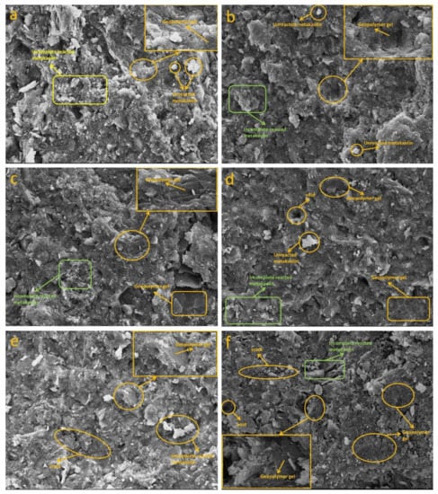 The 28-day SEM micromorphology of K-based geopolymers (K2, K3, K5, K7, K9, and K15 in (a–f), respectively).