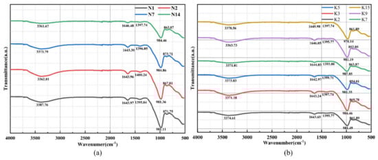 The FTIR technique for the detection of geopolymers can be used to more effectively analyze the bonding states of Si-O and Al-O and the changes in the coordination environment in silicon–aluminum raw materials []. Generally, FTIR spectra can be divided into two main spectral regions: the low-frequency region of 400–1400 cm−1 and the high-frequency region of 1400–4000 cm−1 [,]. From Figure 7a,b, it can be seen that all geopolymer specimens had a strong absorption peak at 970–980 cm−1 for the asymmetric stretching vibration of Si-O-T (T = Si or Al), formed by (AlO4)4− replacing (SiO4)4−, where Al3+ replaces Si4+ in Si-O-Si, forming an aluminum–oxygen tetrahedral structure. It causes a change in the internal structure of the system, which indicates the generation of aluminosilicate gels in the geopolymer. These FTIR bands corresponded to the abundance of quartz and illite in the studied materials. Judging by the sizes and positions of the 970–980 cm−1 FTIR bands, the quantity of quartz and clay minerals decreased successively in the N1, N2, N7, and N14 and K3, K5, and K9 materials []. The higher the height of the characteristic band, the less raw material was depolymerized in the reaction system. This caused the geopolymerization reaction to be not complete enough and had a bad influence on the mechanical properties of the specimen. This argument also corresponds to the mechanical properties of the specimens in Section 3.1. In Figure 7b, as the KOH solution can increase the content of Al in the system, the vibrational energy contained in Al-O is lower than that of Si-O; therefore, the Si-O-T vibrational peak will move to the lower wavenumber range in the K-based geopolymer [,]. The geopolymerization reaction is exothermic and the energy of the whole system will gradually decrease as the reaction proceeds, and the more thoroughly the geopolymerization reaction proceeds, the lower the Si-O-T wave number will be []. Comparing N1, N2, and N14 in Figure 7a and K3, K7, and K15 in Figure 7b, it can be seen that the Si-O-T absorption peaks of both geopolymers shifted toward the low wavenumber range when the influencing factors reached the optimal level or the suboptimal level. It further verified that increasing the alkaline solution concentration and using appropriate (Na2SiO3 + MOH)/MOH and Na2SiO3/MOH mass ratios could promote the geopolymerization reaction and the formation of more silicoaluminate gels. In addition, the characteristic peaks at 3361–3387 cm−1 and 1642.97–1646.48 cm−1 in Figure 7 corresponded to the absorption bands of water molecules. The former is related to the presence of structural and free water in the geopolymer matrix and corresponds to the stretching vibration of [OH]−, while the latter corresponds to the bending vibration of H-O-H []. Apparently, these bands show the absorption of closed water in the sample cavities or water from the surface of the geopolymer structure []. Via longitudinal comparison, in Figure 7a,b, it can be seen that the intensity of the characteristic peak related to water molecules gradually decreased and finally almost disappeared with the increasing concentration of the alkaline solution. This indicated that with the increasing concentration of the alkaline solution, the reaction water was lost more quickly within the reaction system, making the matrix structure denser and improving the mechanical properties. In the Na-based and K-based geopolymers, the absorption peaks at 1393.80–1400.24 cm−1 and 852.05–873.71 cm−1 corresponded to the stretching vibration of CO32−. The former corresponds to the asymmetric stretching vibration of O-C-O and the latter is due to the out-of-plane bending vibrations []. This indicates that carbon dioxide in the air reacts with the remaining alkali in the geopolymer, resulting in carbonation of the structure itself to form carbonates or bicarbonates, leading to a decrease in the strength of the geopolymer. By analyzing the patterns of N2 and K2, as well as N7 and K7, the vibrational peak intensities of the K-based geopolymer were weaker than the Na-based geopolymers at the same mix proportion. This indicated that the geopolymerization reaction of a K-based geopolymer was more complete, forming a denser gel structure that was less affected by carbonation, further verifying that a K-based geopolymer has better mechanical properties.