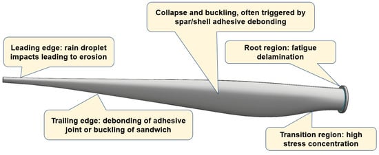 Schema of locations of often-observed damage mechanisms of a wind turbine blade [3,7].