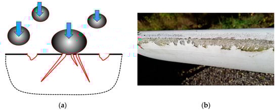 Generally, the surface erosion of wind turbine blades (first of all leading edge erosion) is a complex multiphysical process, strongly influenced by random factors (rain conditions, rain properties, defects in the coatings). Still, the erosion (as said) is most often observed and is the earliest observed damage mechanism of wind turbine blades (1…2 years after installation [19]), which can lead to a reduction in the annual energy production of wind turbines (5% and more) and a reduction in further damage in the laminates.