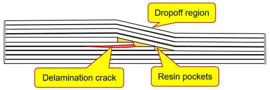 Tapered areas and plydrops in the blades are necessary in the blades to ensure an optimal, aerodynamic shape. Plydrops are formed by terminating some of composite plies. The tapered structures create local stress concentrations, in particular, interlaminar stresses in the vicinity of the ply drop-off which can lead to the delamination of plies and the failure of these regions [50]. Figure 5 shows a schema of a delamination crack in the plydrop region, starting from a resin pocket.