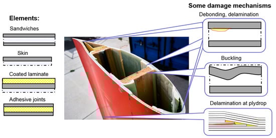 Several regions of wind turbine blades are especially susceptible to degradation, among them, regions subject to the most intensive loading (tip, leading edge), transitional regions (e.g., area of transition from the cylinder to the aerofoil and plydrop), dissimilar and interface-containing regions (with adhesive layers, e.g., trailing edge). According to Refs. [28,29,30,31,32,33], near the root (30–35% of the chord length from the root) and near the tip (70% in chord length from the blade root), the root of the blade, the maximum chord and the upper spar cap/flange of the spar, but also the trailing edge on the high pressure side and on the leading edge are the regions which are damaged most often.