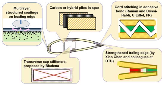 Adhesive joints/bond lines: Joints at the leading and trailing edges, between the shell and main spar, between the spar cap and internal stiffeners can become damaged or debond, and this can lead to the buckling of the structures [17,38]. Blade collapse can occur if the shear web is detached from the shell and buckles. According to [29], the most often observed failure mechanism of blades are transverse cracks in the max chord region (initiated as a skin disbond from the sandwich core) and the disbond of the aft shear web from the blade shell in the root-transition zone (triggered by peeling stresses in the adhesive bondlines). These effects are enhanced by manufacturing defects and torsional loads on the blade [30].