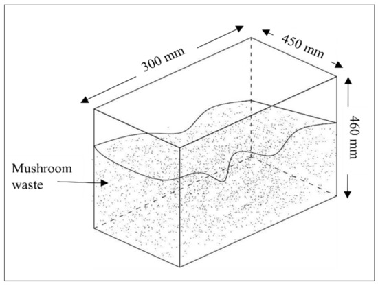 Figure 2 shows set-up 1, which consisted of 10 kg of mushroom waste [MW] substrate on a dry weight basis in a glass jar and was served in four layers at a depth of 100 mm, with 240 mL (60 mL on each layer) of activated EM solution and 4000 mL (1000 mL on each layer) of water spread over the layers. After every three days, the container of waste substrates was opened for aeration and to maintain its moisture content of approximately 50–60% by periodically sprinkling an adequate quantity of water [6]. The same replicates were prepared with raw mushroom waste in set-up 2, as shown in Figure 3.
