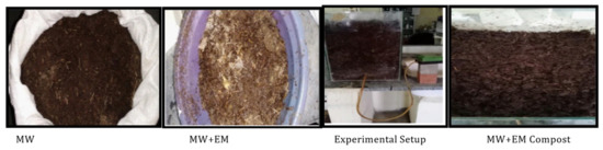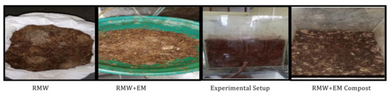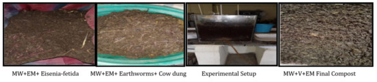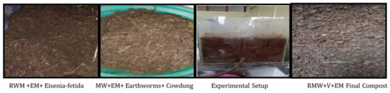 Composting generated odour in all four sets, which indicates the presence of organic waste and other metabolic products produced entirely aerobically and anaerobically [1,31], thereby, increasing and upgrading the bacterial population responsible for decomposition in organic matter during composting, as well as providing a beneficial environment [24,25,26,27,28]. In addition, we observed that the unpleasant smell associated with the composting decreased over time due to the degradation of the material [27,29]. In addition, [MW+V+EM] and [RMW+V+EM] produced an earthy smell in a shorter time due to the capability of earthworms for bioconversions of the substrate to compost compared with [MW+EM] and [RWM+EM].