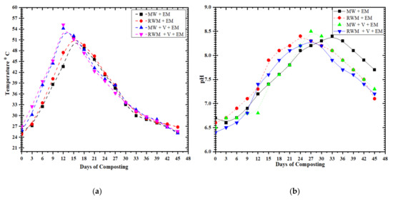 This demonstrates that the [MW+V+EM] (56.2 °C) and [RMW+V+EM] (58.3 °C) samples reached the thermophilic stage (>45 °C) and lasted for 12–14 days, in comparison to the [MW+EM] (50 °C) and [RMW+EM] (52 °C) samples, which reached the thermophilic stage (>45 °C) and lasted for 8–10 days, as shown in Figure 6a, which shows that the EM maintained the minimum requirement of thermophilic stages in all the sets and due to aeration effects, higher biodegradation activity is possible during the loading period [8] in the feedstock via the heat generated by the microorganism population’s respites, and substrate breakdown is possible [1,2,3]. Again, it was seen that the temperatures of all the sets began to drop at the beginning of the third week, suggesting the maturity of the organic matter as demonstrated by the mass reduction in compost volume and odour emission as well [15].