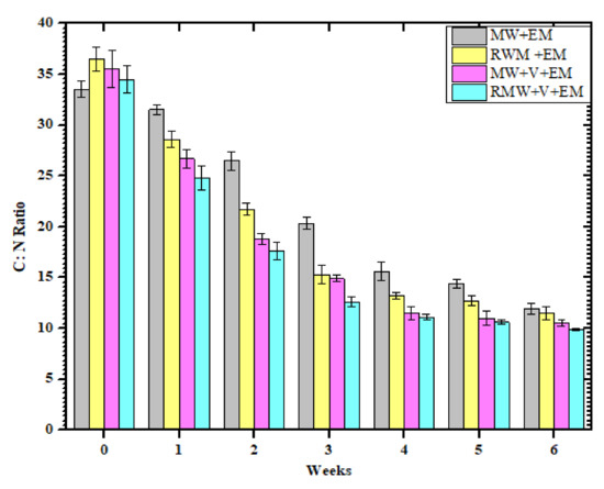 Variation of the C:N ratio within different weeks of [MW+EM], [RMW+EM] [MW+V+EM] and [RMW+V+EM]. Error bars represent standard errors for six samples.