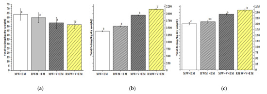 The total concentrations of Cu (a), Fe (b), and Zn (c) of [MW+EM], [RMW+EM], [MW+V+EM], and [RMW+V+EM]. Error bars represent the standard errors for six samples. Columns followed by the same letter do not differ significantly (ANOVA; Tukey’s test, p < 0.05).
