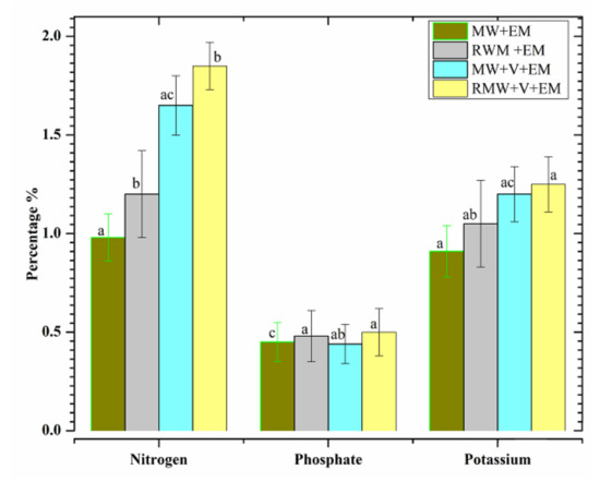 The total concentrations of the NPK values of [MW+EM], [RMW+EM], [MW+V+EM], and [RMW+V+EM]. Error bars represent standard errors for six samples. Columns followed by the same letter do not differ significantly (ANOVA; Tukey’s test, p < 0.05).