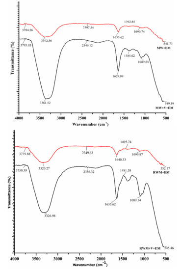 Variation of FTIR of the samples: [RWM +EM], [MW+EM], [MW+ V+EM], and [RWM+V+EM].