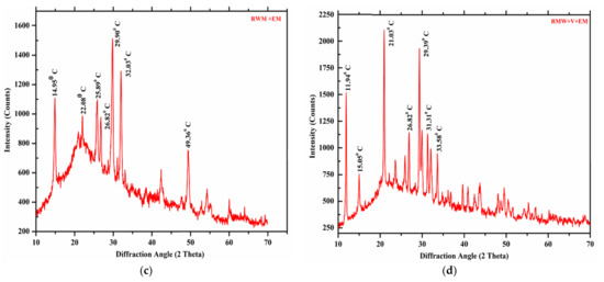 XRD analysis of the sample (a) [MW+EM], (b) [MW+V + EM], (c) [RWM+EM], and (d) [RMW+V+ EM].