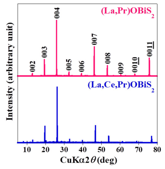Figure 2. Typical XRD pattern of a well-developed plane of (La,CePr)OBiS2 and (La,Pr)OBiS2 single crystals.