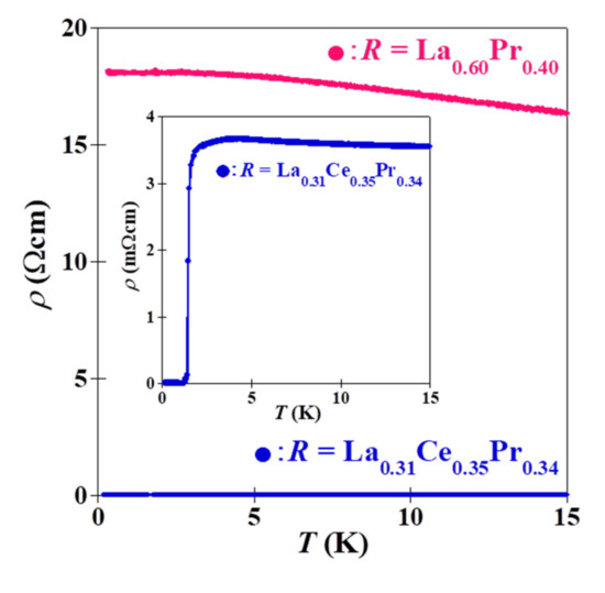 Figure 3. ρT characteristics parallel to the c-plane in the temperature range 0.2–15 K for the La0.31Ce0.35Pr0.34OBiS2 and La0.60Pr0.40OBiS2 single crystals. The inset is an enlargement of the lower-resistivity region.