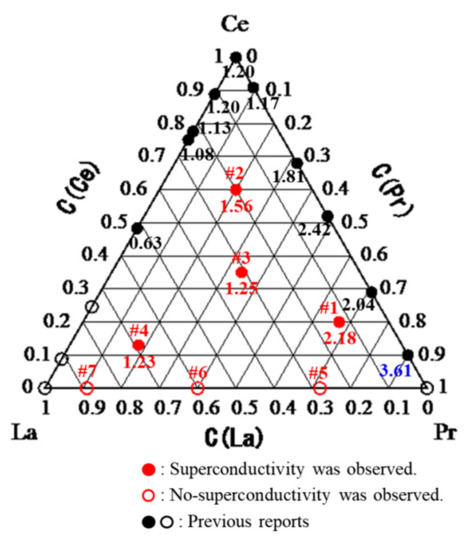 Figure 4. Relationship between the superconducting transition temperature (Tc) and the compositions of the rare-earth elements (La,Ce,Pr) analyzed. The values in the ternary diagram are Tczero, in kelvin (K).