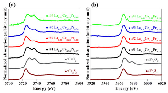Figure 5. (a) Ce L3-edge and (b) Pr L3-edge absorption spectra using XAFS spectroscopy at room temperature for the grown (La,Ce,Pr)OBiS2 single crystals and standard samples for each valence state (Ce3+: Ce2S3; Ce4+: CeO2; and Pr3+: Pr2S3; Pr4+: Pr6O11).
