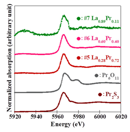 Figure 6. Pr L3-edge absorption spectra using XAFS spectroscopy at room temperature for the grown (La,Pr)OBiS2 single crystals, Pr2S3 and Pr6O11.