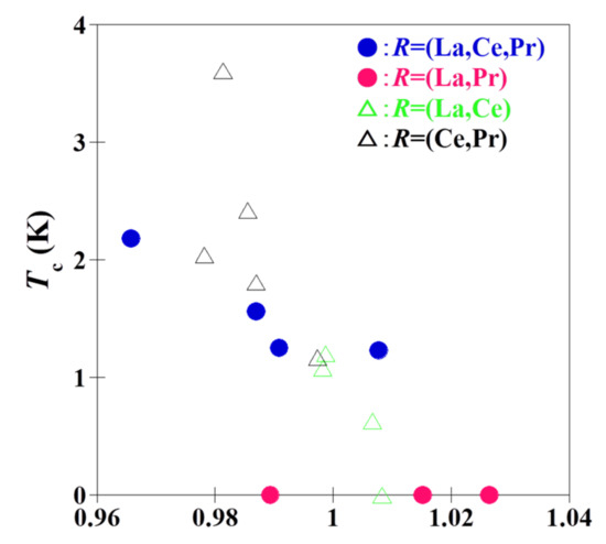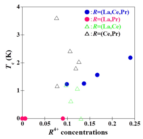 Herein, we discuss the effect of valence states and ionic radius on binary and ternary ROBiS2. Figure 7 shows the dependence of the tetravalent electronic configuration (R4+) concentrations on Tc for the binary and ternary ROBiS2 single crystals. While binary ROBiS2 exhibits little correlation between the ratio of tetravalent ions and Tc, ternary ROBiS2 demonstrates a clear correlation between them; an increased ratio of tetravalent ions increased Tc. This result indicates that the electronic state of ternary ROBiS2 is different from that of binary ROBiS2. Figure 8 shows the relationship between the mean R-site ionic radius [28] considering the valence state (R3+ and R4+) and the Tc for binary and ternary ROBiS2 single crystals. The Tc decreased with an increase in the mean R-site ionic radius. Although some anomalous data have been noted, this trend was consistent with the chemical pressure effect at the R-site [29]. There was no significant difference in terms of ionic radius between binary and ternary ROBiS2. Thus, ternary ROBiS2 is more sensitive to the electronic configuration, while both binary and ternary ROBiS2 have similar trends in their ionic radius. Additionally, these results reveal that Ce-substitution at the R-site is required for superconductivity.
