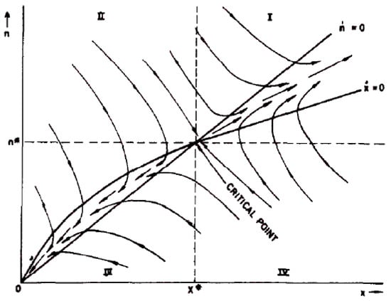 Example of phase portrait of solute atoms in precipitates (x) and vacancies (n) calculated under irradiation. Reprinted with permission from Ref. [19]. Copyright 1977 Elsevier. At large time, the system can reach two distinct attractors: a stable node (0,0) and a the saddle critical point (x*,n*). The existence of these attractor partition the abstract x-n plane in four distinct quadrants. The arrows displays the velocities of the solute atoms and vacancies in each quadrant (I to IV).