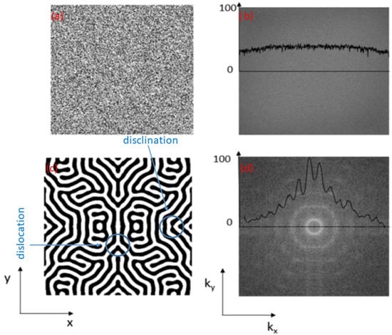 The existence of nano-structures displayed in Figure 2 generalizes the notion of topological defects defined for equilibrium structures and are generally the rule beyond pattern forming instabilities, as it is the case in equilibrium phase transitions [26,33]. In graph c of Figure 2, disclination and geometrical dislocation are clearly visible.