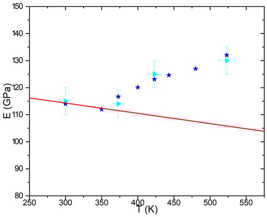 Comparison between experimental Young moduli (navy triangles) extracted from nano-indentation experiments performed on thin films and computed from application of the Phase Field approach including elastic terms (blue stars) versus the temperature. The red line is displays Young moduli resulting from a simple lever rule neglecting the formation of nano-structures under irradiation.