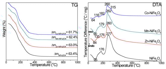 TG and DTA curves of virgin and doped NiFe2O4 (Zn-NiFe2O4, Mn-NiFe2O4, Co-NiFe2O4) dried at 40 °C.