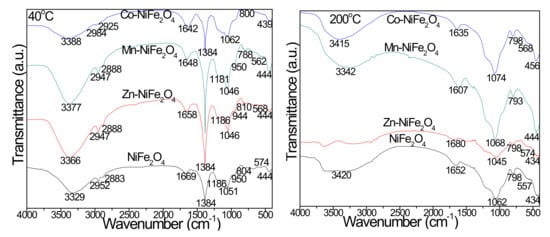 FT-IR spectra of virgin and doped NiFe2O4 (Zn-NiFe2O4, Mn-NiFe2O4, Co-NiFe2O4) heated at 40 and 200 °C.