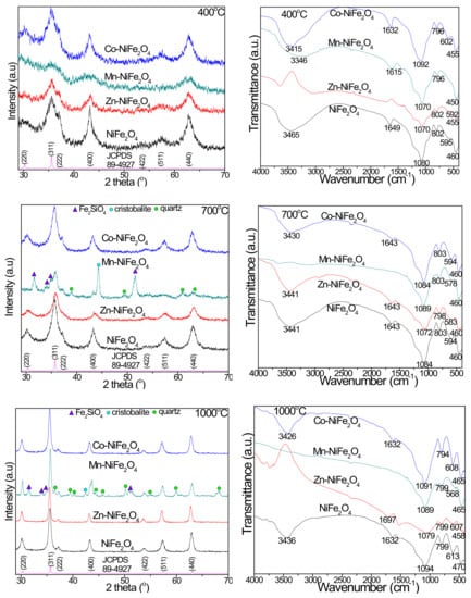 XRD patterns and FT-IR spectra of virgin and doped NiFe2O4 (Zn-NiFe2O4, Mn-NiFe2O4, Co-NiFe2O4) samples annealed at 400, 700, and 1000 °C.