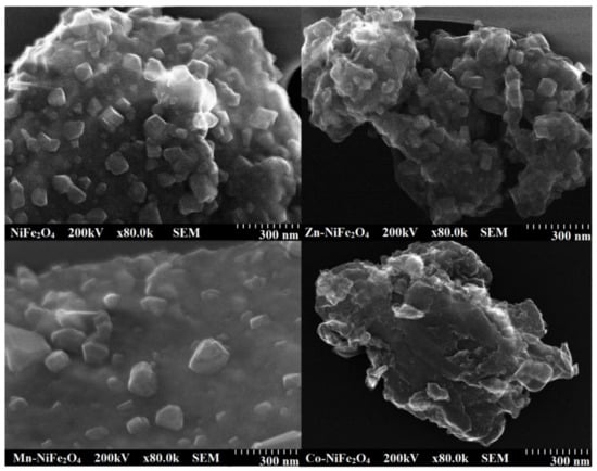 The SEM images (Figure 6) indicates agglomerations of homogenous, clearly delimited particles typical of ferrite materials containing magnetic elements []. The particles in Zn and Co dopped NiFe2O4 have a homogenous microstructure with closely packed, irregularly shaped small particles, whereas those in Mn dopped NiFe2O4 are bigger and more loosely packed.