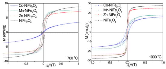By doping NiFe2O4, the HC decreases at 700 °C and increases at 1000 °C as a consequence of increased spin disorder in the surface layer and smaller particle size [,]. The HC value of 48 Oe of virgin NiFe2O4 decreases to 11 Oe in case of Co doping and annealing at 700 °C, most probably due to agglomerates’ formation which leads to the increase of average particles size above the critical single domain of NiFe2O4 particles and further leads to a multidomain magnetic structure []. Moreover, by annealing at low temperatures, the grain growth occurs, weakening the domain wall pinning effects at the grain boundary [].