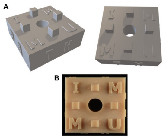 The 3D design of surgical guides (A) and printed surgical guide (B).