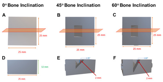 Bone models showing bone inclinations; 0° (A,D), 45° (B,E), and 60° (C,F). (A–C) are top view and (D–F) are side view.