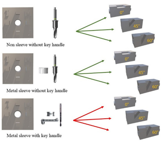 - El Kholy, K.; Janner, S.F.M.; Schimmel, M.; Buser, D. The influence of guided sleeve height, drilling distance, and drilling key length on the accuracy of static computer-assisted implant surgery. Clin. Implant Dent. Relat. Res. 2019, 21, 101–107. [Google Scholar] [CrossRef]