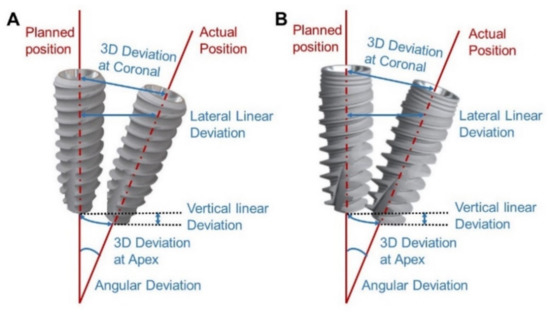 Deviation measurements and deviation parameters. (A). Dentium superline and (B). Nobel active.
