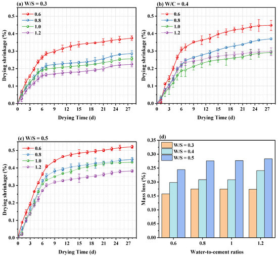 - The higher drying shrinkage and mass loss of CPBs with a W/S ratio of 0.5 compared to that with a W/S ratio of 0.3 are due to the higher capillary pores volume; the increasing W/C ratios of CPBs lead to lower shrinkage strain but slightly higher mass loss during drying, which is attributed to the higher capillary pores volume and the larger mean pore size;