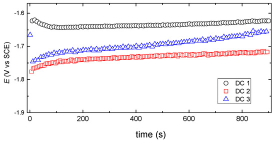 In Figure 1, the cathode potential curve versus the deposition time for the DC deposits shows only a small change in deposition potentials over time, indicating a stable bath operation and the fulfillment of a stationary plating condition.