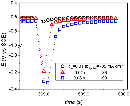 The galvanostatic square pulses were applied with varying pulse times and duty cycles at the same time period of 0.2 s. The plating was performed at pulse-on times of 0.01–0.02–0.03 s and pulse-off times of 0.19–0.18–0.17 s for a pulse frequency of 5 Hz. The plating duration was 600 s.