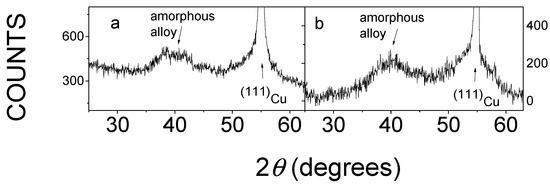 All diffractograms consist of very broad lines centered mainly around 2θ = 40° and sharp lines. The broad lines are associated with the amorphous metallic phase. The sharp lines belonging to the reflections of Cu substrate and the (111)Kα and (200)Kβ Cu reflections at 2θ = 55.3° and 2θ = 58.1°, respectively, can be seen in Figure 5. The occurrence of Cu reflections in X-ray diffractograms is due to the fact that the thickness of the deposits (~1–5 μm, see Table 2) is much smaller than the X-ray penetration depth (~20 μm); thus, the pattern of Cu substrate is strongly reflected.