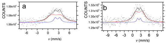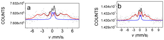119Sn conversion electron Mössbauer spectra of DC3 (a) and PP3 (b) electrodeposited quaternary Sn-Fe-Ni-Co alloy coatings. The red and blue components show the ferromagnetic and paramagnetic amorphous phases, respectively, while the black line indicates their spectral superposition.