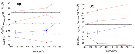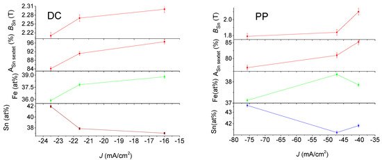 Figure 8 and Figure 9 show that both iron and tin hyperfine magnetic fields, BFe and BSn, increase with the decreasing absolute value of current density. This is observed for both the DC and PP deposits. However, the average hyperfine magnetic field values were lower for the PP deposits than for the DC deposits. At the same time, the hyperfine fields show correlation with the change in the iron and tin content, which increases and decreases, respectively, as a function of the current density.