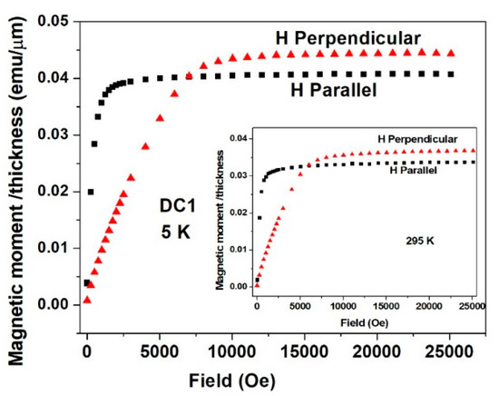 The difference in saturation moment values between data measured at 5 and 295 K is ~17% (for DC1) for both directions, which indicates that the magnetic transition temperature (Tc) is well above room temperature.