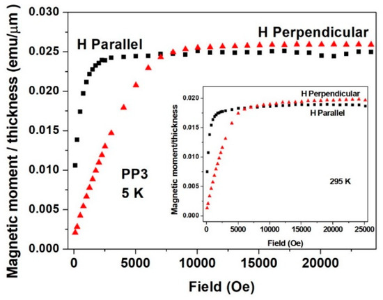 Figure 10 and Figure 11 show two typical experimental m(H) curves recorded for the DC1 and the PP3 deposited quaternary Sn-Fe-Ni-Co alloys, and their parameters are shown in Table 2. All the curves exhibit a ferromagnetic behavior with a pronounced anisotropy. The parallel m(H) curves increase sharply and are almost saturated around 2000 Oe, whereas the perpendicular m(H) branches saturate around 12,000 Oe, clearly indicating that (a) the parallel direction is the easy axis of the magnetization, which confirms the well-known evidence that in multi-layered magnetic deposits, the magnetic moments align in the coated planes; and (b) the difference in the saturation moment (ms) values between data measured at 5 and 295 K is ~17% for both directions, indicating that the magnetic transition temperature (Tc) is well above room temperature; (c) at saturation, the ms for the perpendicular direction (the hard axis) is higher (by 10%) than ms for the parallel one, whereas at lower fields, the parallel moments are higher, as presented hereafter (Figure 14). Similar behavior was obtained for the PP3 material (Figure 11), but here, the difference between ms measured in both directions decreases to 4% only. Higher ms along the hard axis was also observed in other Fe-Sn alloys and can be attributed to a slightly better aligned microstructure of the deposits [24].