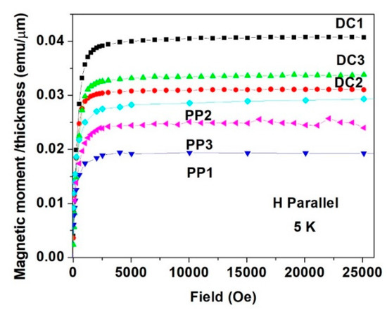 Parallel field dependence of the magnetic moment curves measured at 5 K for all DC and PP deposited quaternary Sn-Fe-Ni-Co alloy coatings.