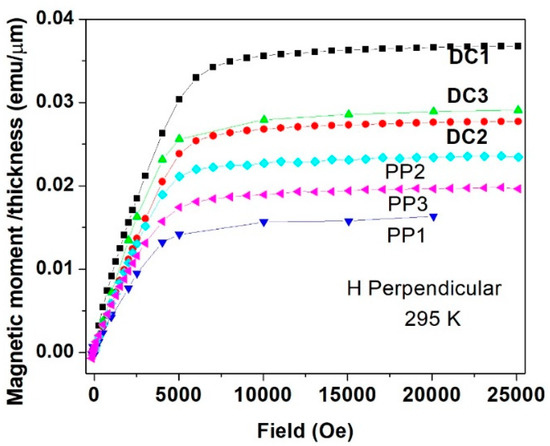 Perpendicular field dependence of the magnetic moments measured at 295 K for all DC and PP deposited quaternary Sn-Fe-Ni-Co alloy coatings.